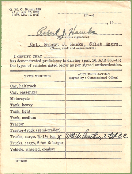 Soon after he was being trained in survey school, and it turned out that it would be very useful to be certified to drive a jeep (or in the Army parlance, a "Truck, cargo, 1/4 ton"). He returned to retake the driving test – and got the same instructor. He aced the test and got his permit – and a good “cussing out.”
