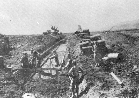 below: Constructing a culvert across the runway using fifty-gallon drums