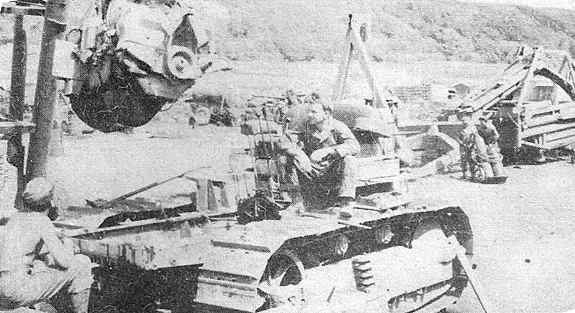 below: Using a mobile crane to pull a diesel engine out of a caterpiller tractor during runway grading